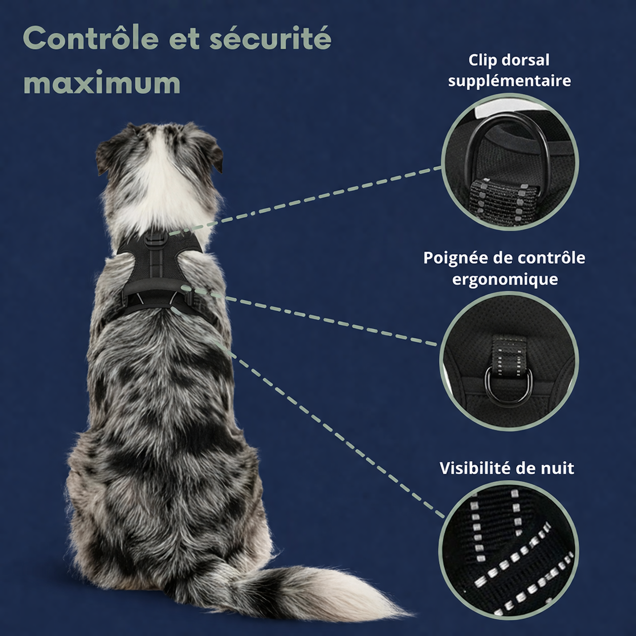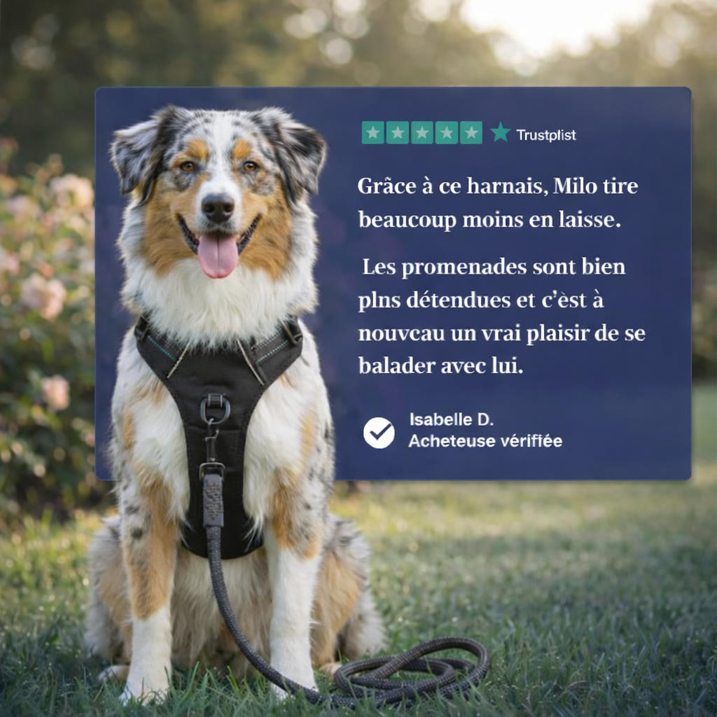 🐶 Stress-free, calm walks together 💖 Gentle protection for your dog’s neck ✋ Total control with a secure back handle ✨ Reflective safety for peaceful evening strolls