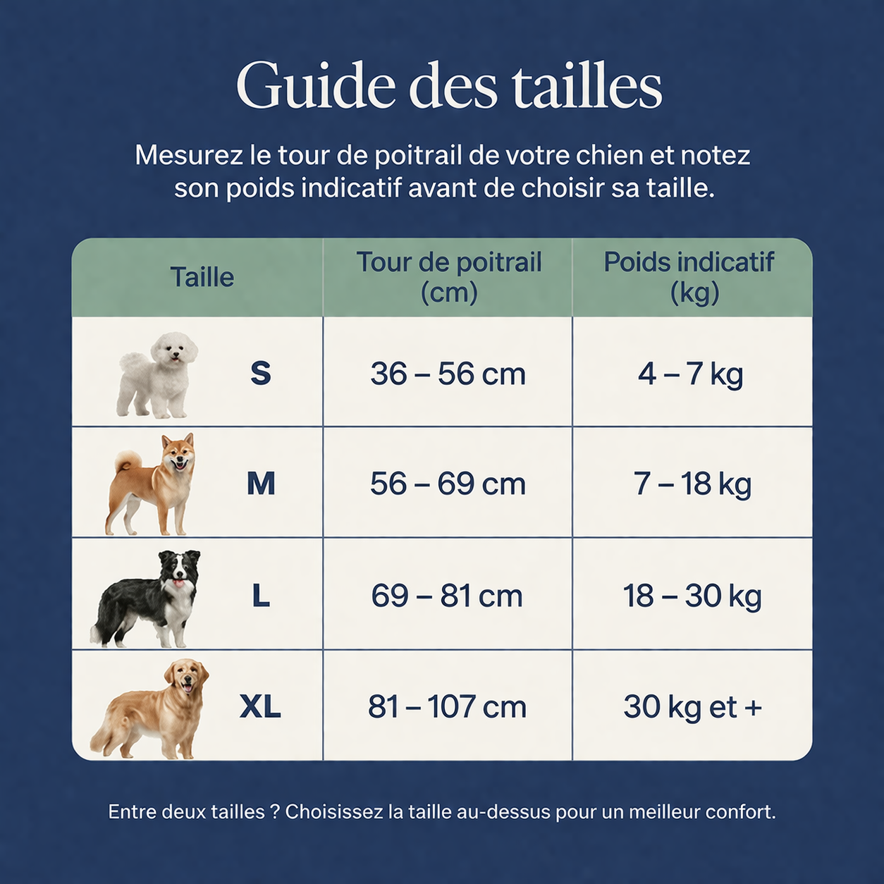 Our harness comes in four sizes: Small (4-7kg), Medium (7-18kg), Large (18-30kg), and Extra Large (30kg+). If your furry friend is between sizes, we recommend choosing the larger size for maximum comfort. The 4-point adjustment system ensures a snug, secure fit for any body type.